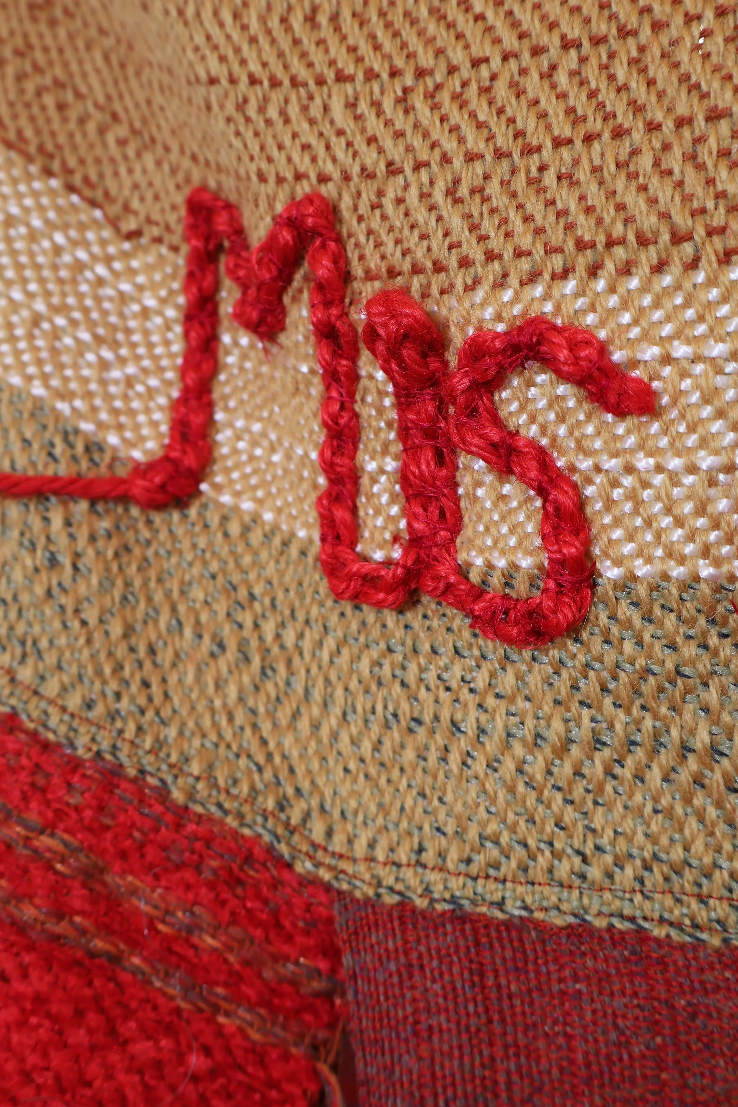 This is my most literal piece—a protest textile titled Mis Derechos (translated: My Rights). The piece includes the powerful statement “We Feed You,” emphasizing the essential contributions of immigrant labor. It’s made up of five woven experimental pieces. The lettering is crocheted and stitched onto the fabric, adding a tactile layer to the message.